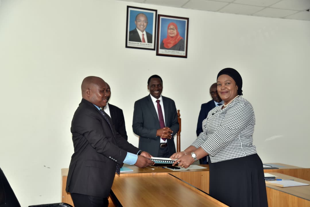 Mkuu wa Chuo Prof. Haruni Mapesa aliyesimama katikati akishuhudia Dkt. Rose Mbwete Mkurugenzi aliyemaliza muda wake akimkabidhi nyaraka Mkurugenzi mpya wa Kampasi hiyo Dkt. Sifuni Lusiru