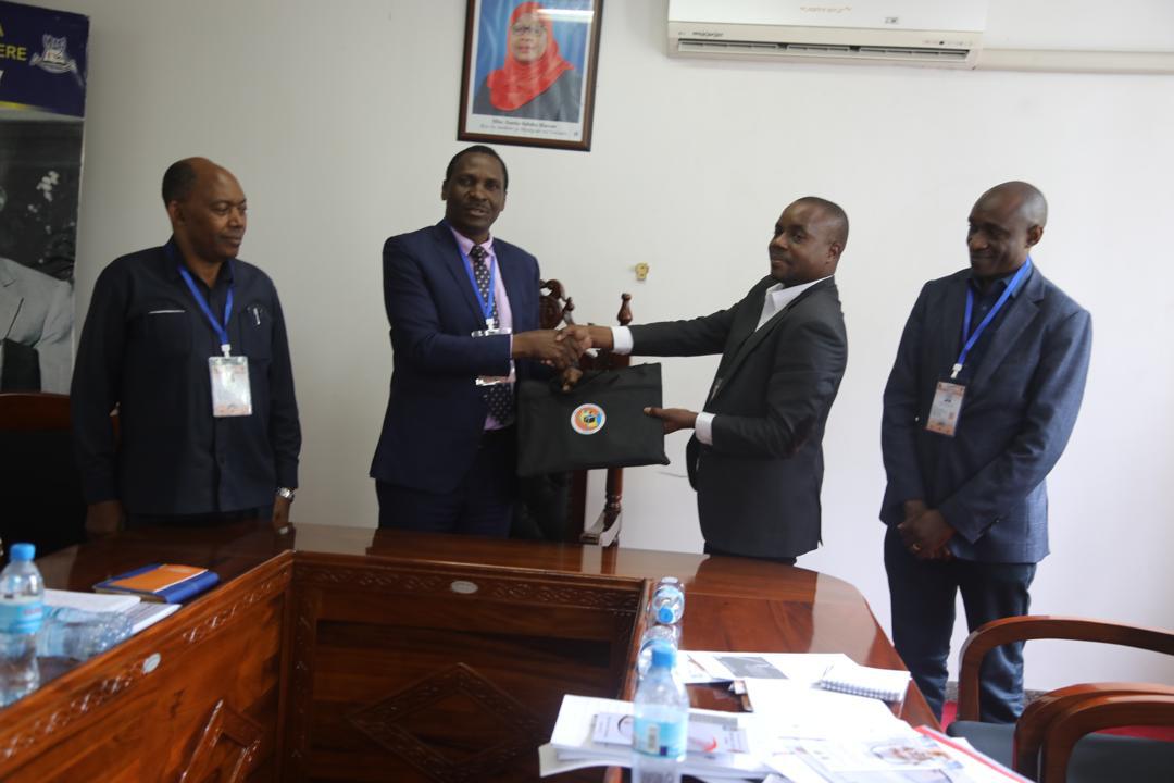 Makamu Mwenyekiti wa Chama cha Mapinduzi na Mwenyekiti wa bodi ya Chuo Mhe. Stephen Wasira akimkabidhi zawadi ya tuzo Mgeni rasmi Mhe. Naibu Waziri Mkuu na Waziri wa Nishati Mhe. Dkt. Biteko wakati wa Kongamano la kumbukizi ya kuzaliwa Baba wa Taifa Mwalimu JK. Nyerere lililofanyika Chuoni hapo.